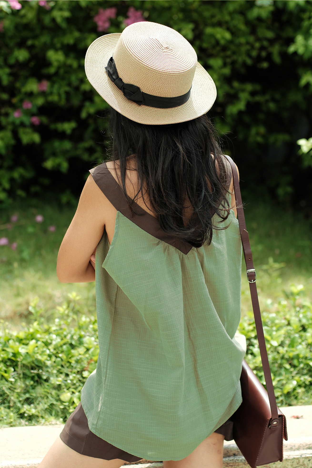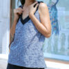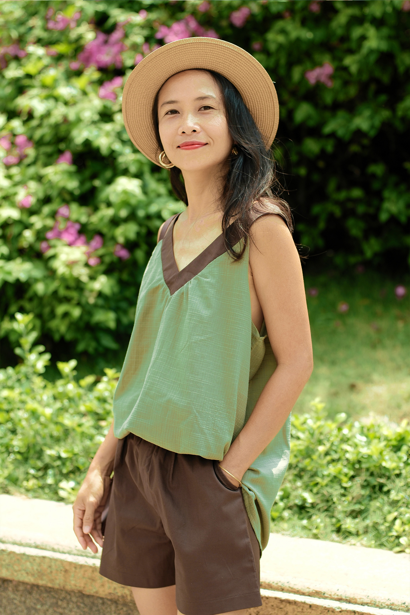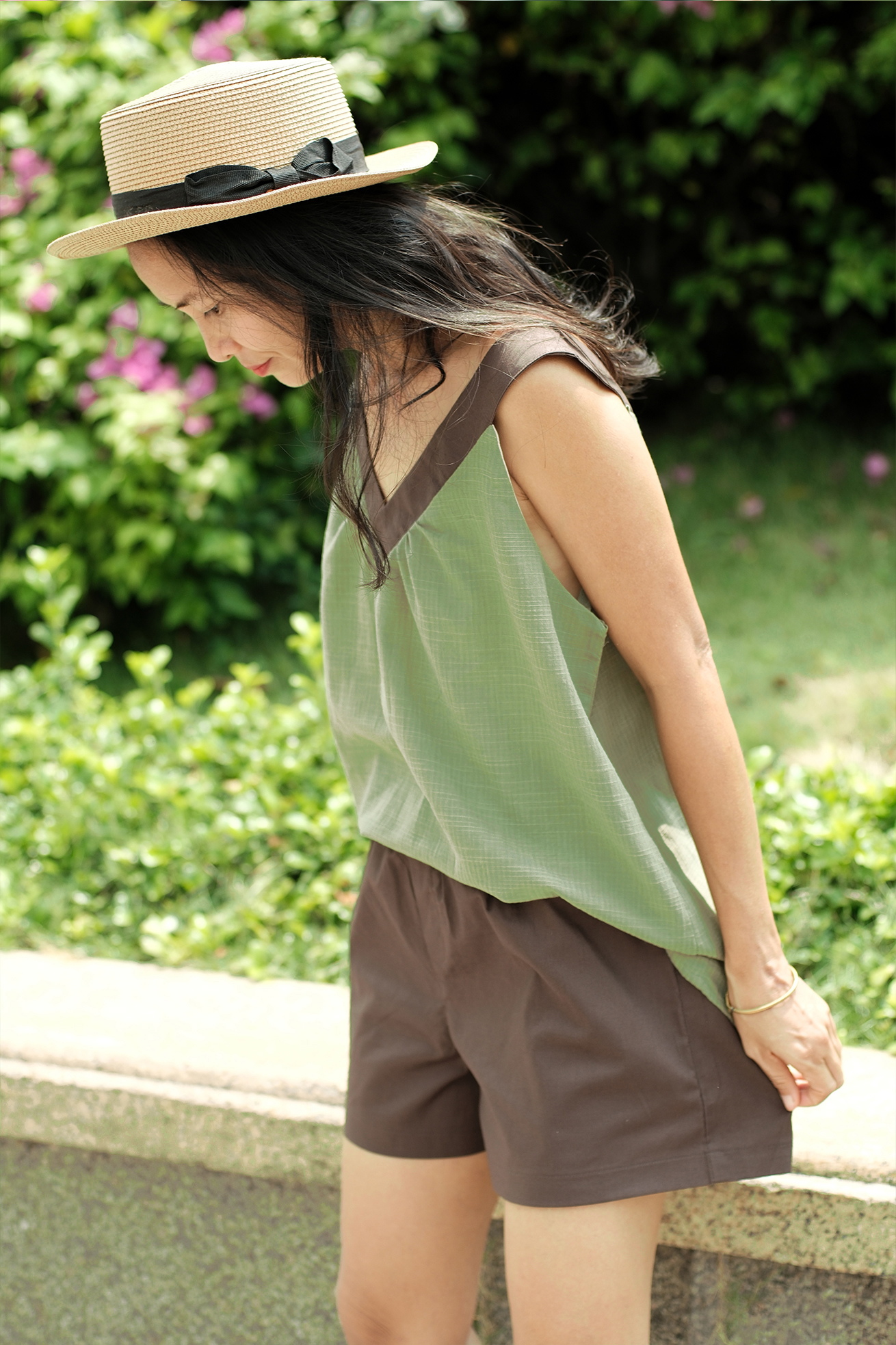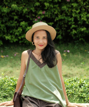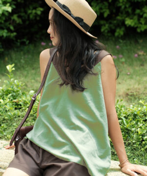 – Bộ hai dây cổ tim xanh phối nâu, quần ngắn, lưng thun có 2 túi xéo. Áo màu xanh vỏ đậu/đỗ