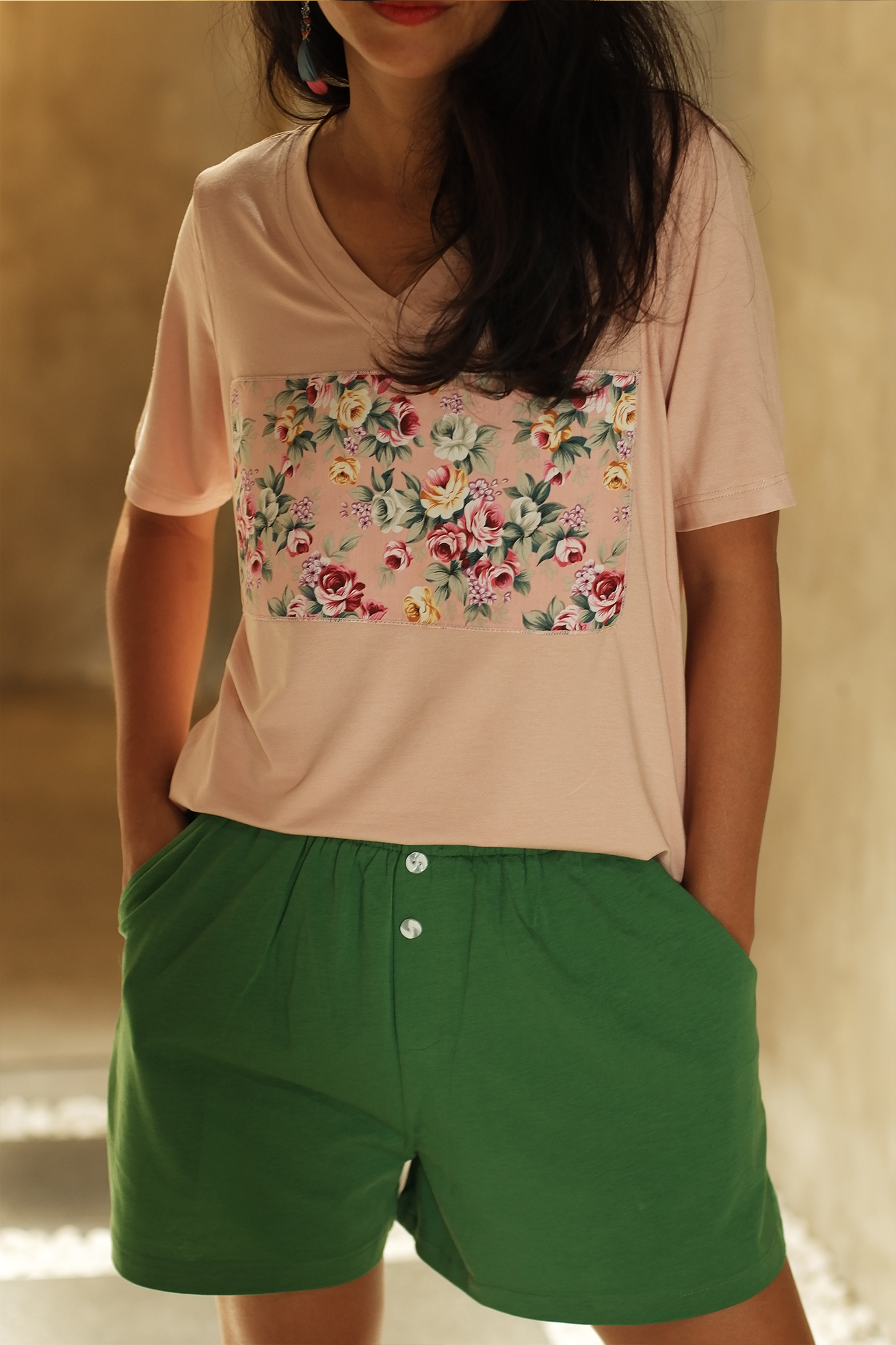 – Bộ áo cổ tim tay ngắn, quần ngắn, lưng thun, có 2 túi xéo