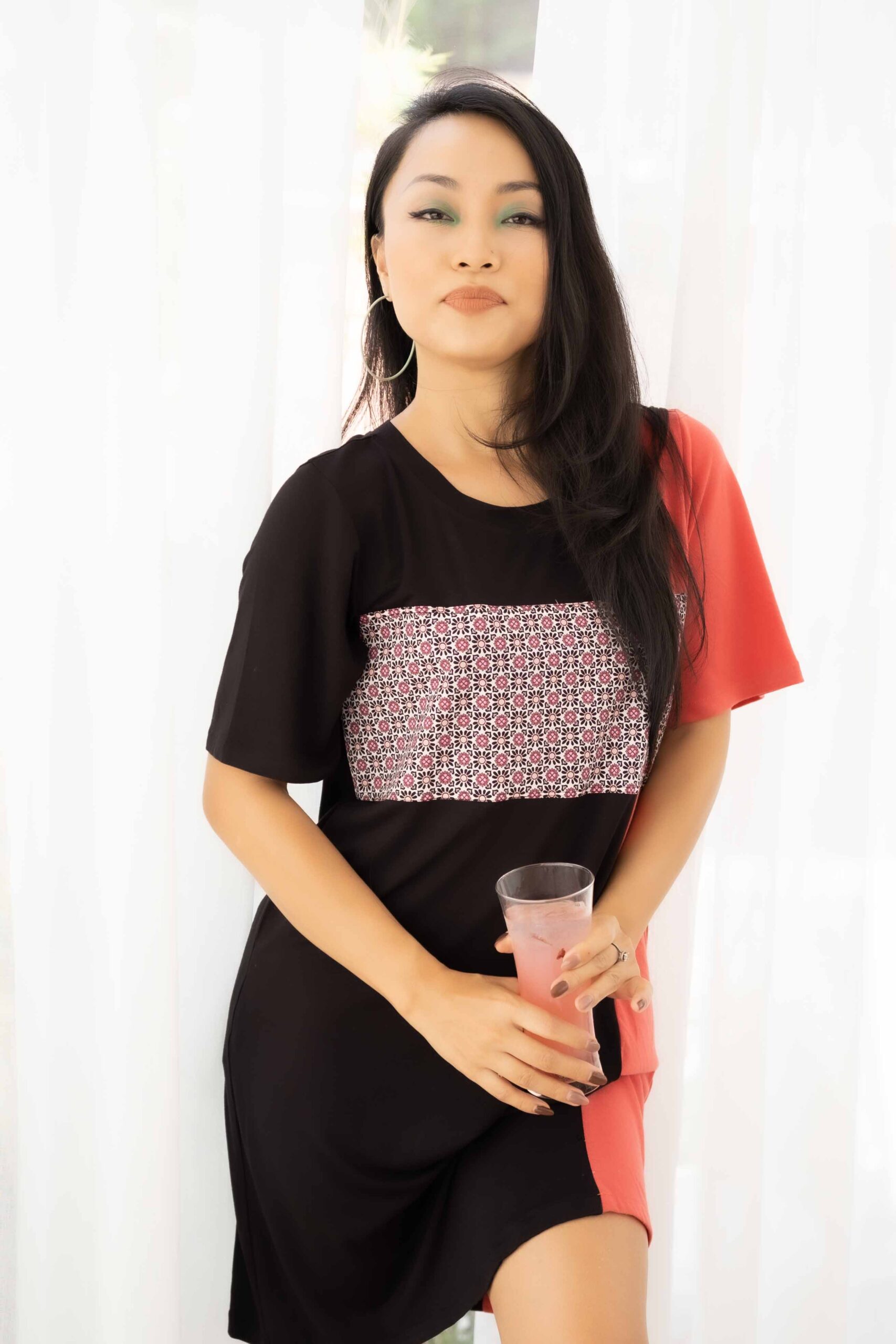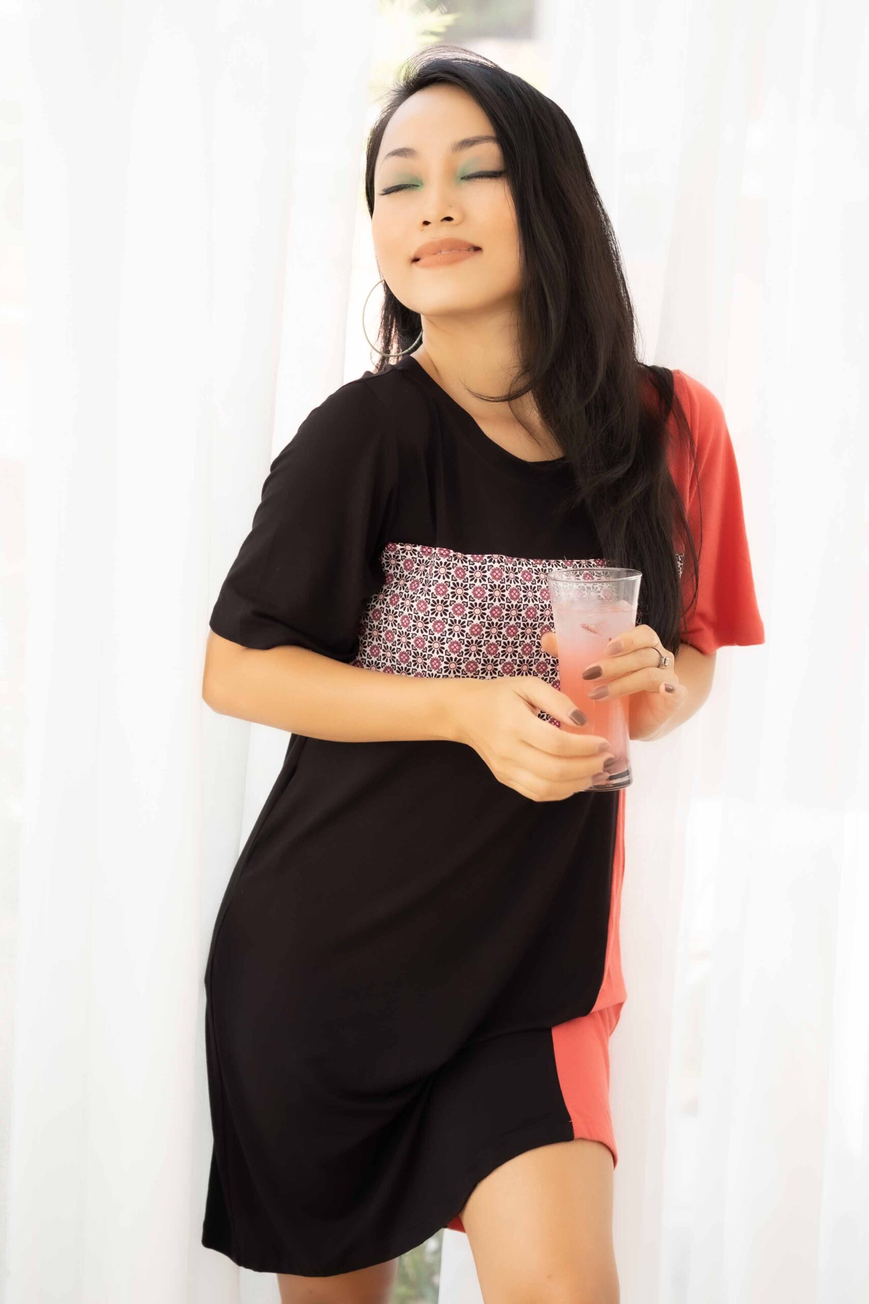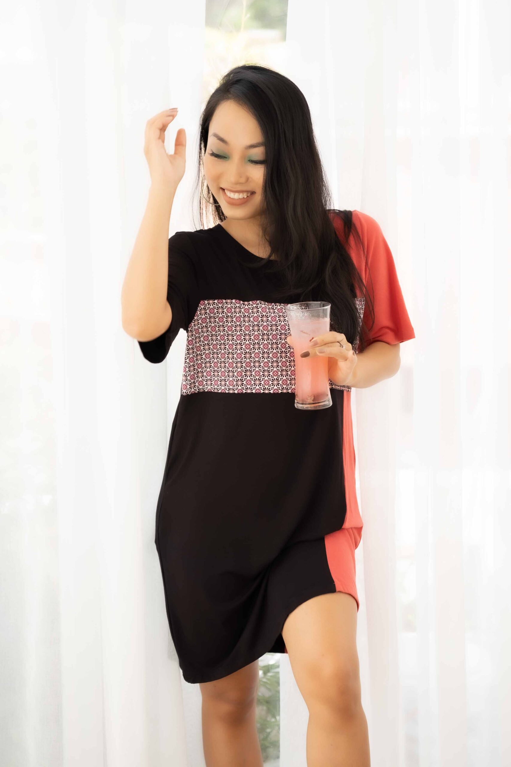 – Đầm cổ tròn đen phối cam, chất liệu thun cotton, dài 90cm